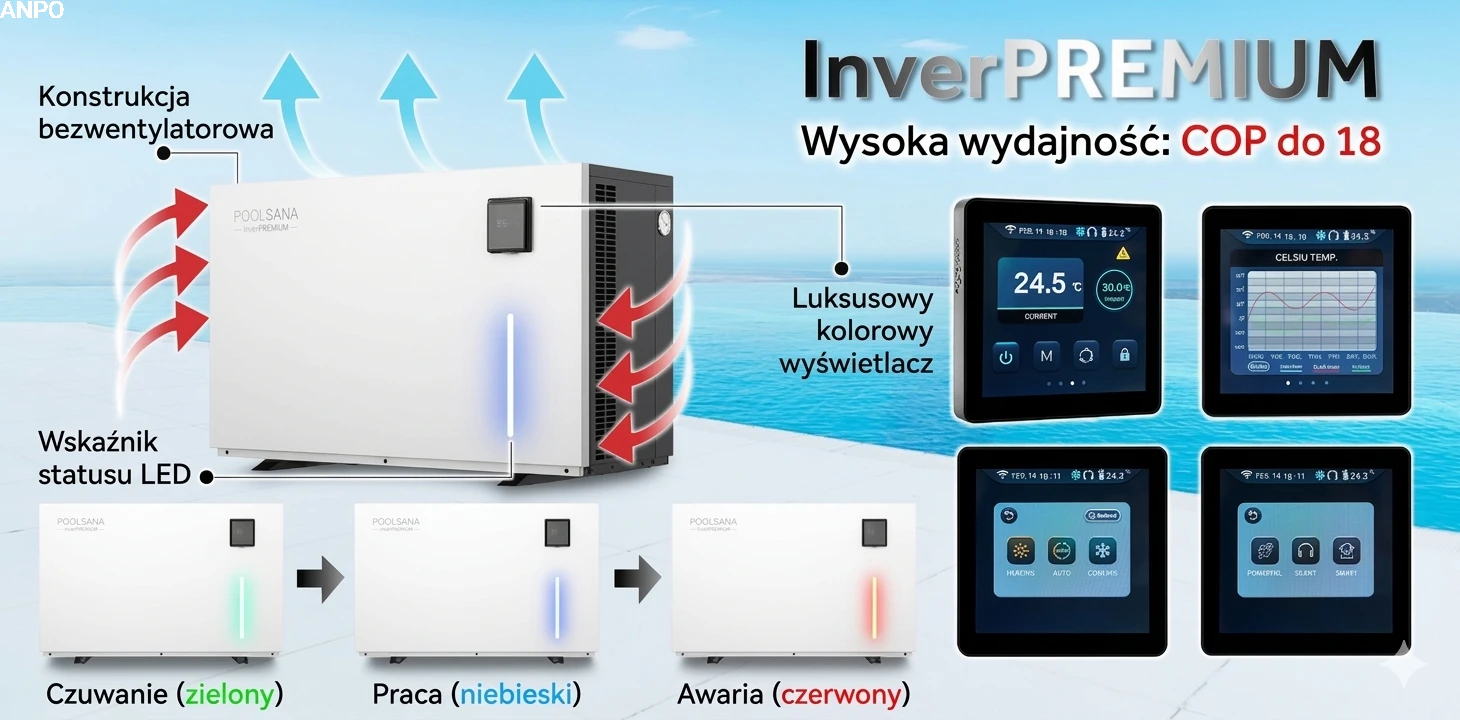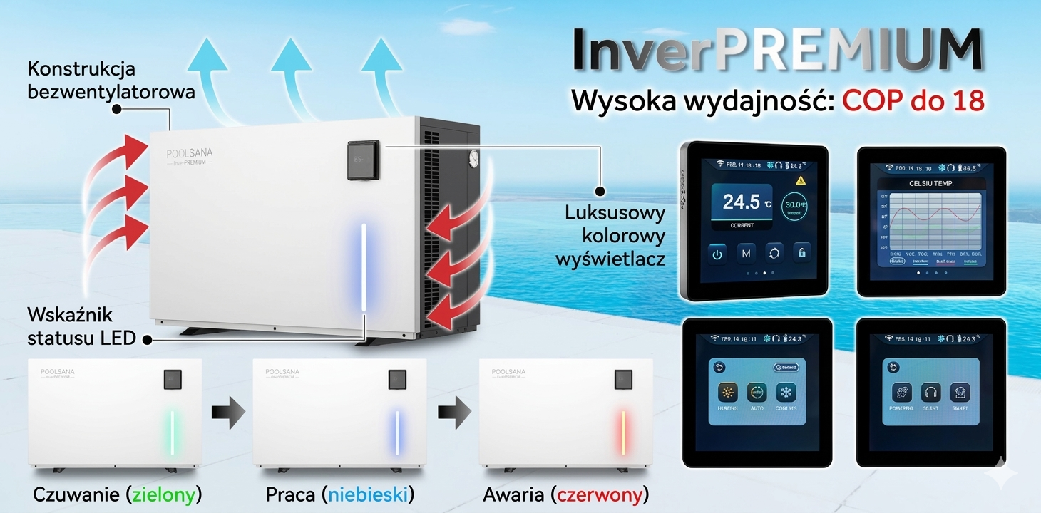 Od nadzwyczajnej wydajności po wyjątkowy komfort, pompy ciepła do basenów z serii POOLSANA InverPREMIUM wyznaczają nowe standardy na każdym poziomie ogrzewania wody. Serce urządzenia stanowi wysokiej klasy sprężarka marki Mitsubishi, a dzięki imponującemu współczynnikowi COP wynoszącemu aż do 18, podkreśla swoją niezawodność i unikalną energooszczędność opartą na technologii Full-Inverter:
